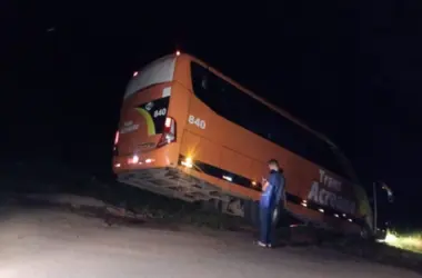 Um ônibus da empresa Trans Acreana, que fazia o trajeto entre Cruzeiro do Sul e Rio Branco, quase tombou após sair da estrada na madrugada