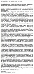 Foi publicado na edição desta quarta-feira, 10, do Diário Oficial, o decreto que declara Situação de Emergência Social nos municípios de Brasiléia e Epitaciolândia, afetados