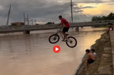 Um jovem chamou a atenção nesta terça-feira (18) ao realizar uma manobra arriscada, se lançando de bicicleta nas águas do Rio Acre, na região da