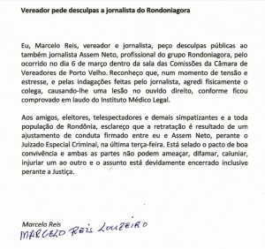 O vereador mais votado de Porto Velho, Marcelo Reis (PV), pediu desculpas públicas, ao vivo, em seu programa Comando Policial, da TV Alamanda, afiliada do