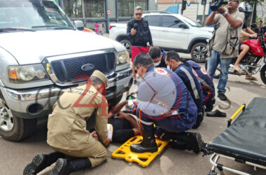 Um acidente envolvendo uma caminhonete e uma motocicleta foi registrado na manhã desta sexta-feira, 7, na Avenida Brasil, no cruzamento próximo ao Centro Empresarial, em