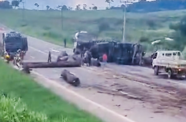 Um caminhão carregado com toras de madeira tombou na BR-317, nas proximidades de Plácido de Castro, no interior do Acre, na tarde desta segunda-feira, 27.