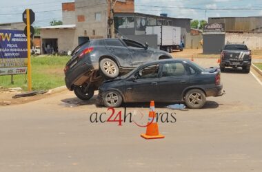 Uma colisão envolvendo dois veículos deixou o trânsito lento e chamou a atenção de várias pessoas que passavam pela rotatória do bairro Amapá, próximo ao