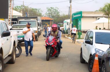 O governador Gladson Cameli (PP) e seu filho, Guilherme Cameli, chegaram ao Parque de Exposições Wildy Viana pilotando uma motocicleta Honda CBR-650 na manhã deste