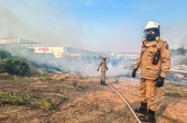 Imagens capturadas com exclusividade pelo ac24horas mostram homens trabalhando para controlar um incêndio que se alastrou em um grande terreno às margens da Via Verde,