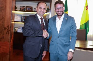 No Palácio Rio Branco, o governador Gladson Cameli se reuniu com o presidente do Tribunal Regional Eleitoral do Acre (TRE-AC), desembargador Júnior Alberto, e colocou