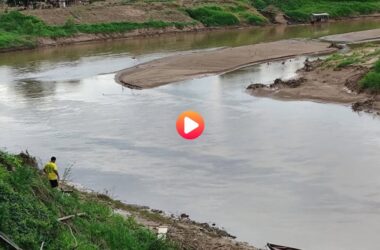 Uma imagem publicada em uma rede social por um internauta, mostra como está baixo o nível do Rio Acre em Xapuri. No vídeo, dois homens