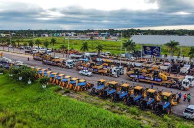 Cerca de 300 máquinas pesadas foram apresentadas no estacionamento do estádio Arena da Floresta, em Rio Branco, nesta segunda-feira (1°), durante lançamento do programa Asfalta