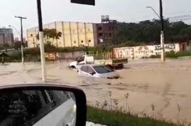 Um vídeo gravado na manhã desta quarta-feira, 6, mostra o momento em que um motorista resolve “enfrentar” a água e fica com o carro praticamente