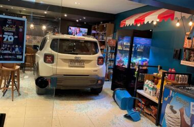 Um motorista não identificado que estava em um carro modelo Jeep, de cor branca, invadiu a conveniência Pão de Queijo, localizada num posto de gasolina