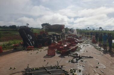 Uma colisão entre dois caminhões, sendo que um deles que transportava frutas, interditou totalmente nesta quinta-feira, 29, a BR-364, no km 1.027, a cerca de