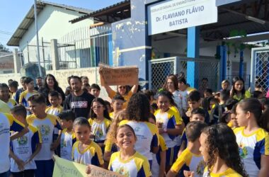 Pais de alunos da escola estadual de ensino fundamental Dr. Flaviano Flávio Batista, no bairro Aeroporto Velho, em Rio Branco, se manifestam na manhã desta
