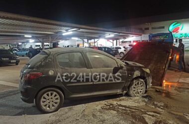 Um veículo modelo Peugeot, de cor cinza, placa KRW-1441, ficou com o motor destruído na noite desta terça-feira, 23, após incendiar no estacionamento do Supermercado
