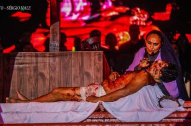 A encenação dos últimos momentos da vida de Jesus Cristo foi realizada na noite desta sexta-feira Santa, 7, em um espaço montado em frente ao
