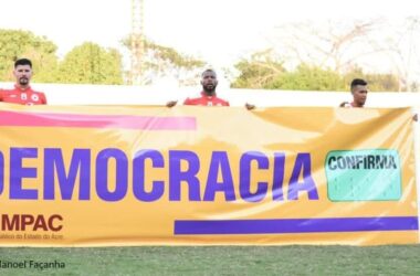 Os jogadores do Rio Branco FC entraram em campo, no estádio Florestão, em Rio Branco, no último domingo, 7, com uma faixa da campanha Democracia: