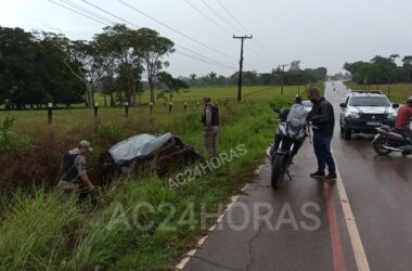 Um acidente de trânsito deixou duas pessoas feridas, com o veículo parcialmente destruído na tarde deste sábado, 18, na rodovia AC-40, no km 1, do