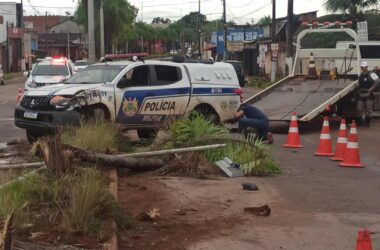Um acidente de trânsito envolvendo uma viatura da Polícia Militar derrubou duas palheiras, um poste de iluminação e deixou Avenida Amadeo Barbosa, no Bairro Areal,