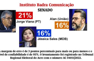 O Instituto Badra Comunicação, de São Paulo, divulgou também nesta sexta-feira, 6, as intenções de voto para a única vaga do Acre ao senado que