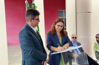 Durante lançamento das ações, presidente do Tribunal, desembargadora Waldirene Cordeiro, e governador Gladson Cameli, assinam Termo de Compromisso de Cooperação Técnica para reforma das instalações do Judiciário no município