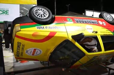Logo no portão principal da Expoacre 2023, há um simulador de capotamento do Detran. Um veículo roda em ângulo de 360 graus várias vezes, causando