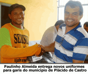 O Prefeito de Plácido de Castro, Paulinho Almeida [PT], participou da entrega dos uniformes pela Secretaria Municipal de Serviços Urbanos (SEMSUR) aos garis da cidade.