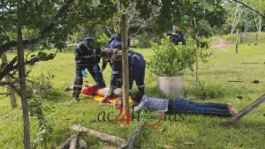 O criminoso Matheus da Silva Ferraz, de 24 anos, foi ferido com dois tiros, e o seu comparsa, um adolescente, foi apreendido na tarde desta