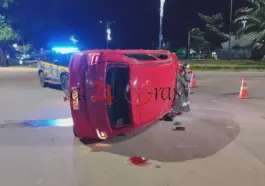 Um acidente de trânsito envolvendo dois veículos deixou uma idosa e um homem com escoriações, além de um carro tombado, na noite desta segunda-feira (12),