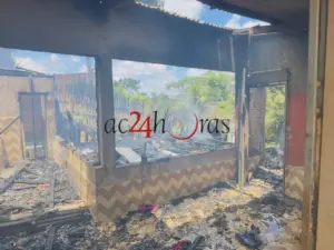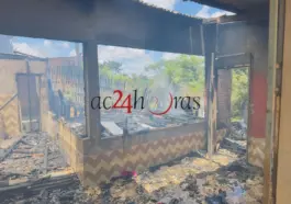 Uma residência construída em madeira e alvenaria foi totalmente destruída por um incêndio no início da tarde desta quarta-feira (14), na Rua Pirapitinga, Invasão do