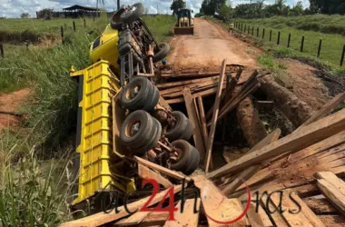 Um caminhão caçamba caiu em um igarapé na manhã deste domingo, 25, após uma ponte improvisada de madeira desabar durante a travessia. O acidente ocorreu