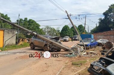 Uma perseguição policial resultou em um veículo clonado batendo e derrubando um poste de energia elétrica na manhã desta segunda-feira (2), na Avenida Durval Camilo,