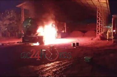Uma carreta carregada de piche-asfalto na forma líquida-, foi consumida pelas chamas na madrugada desta segunda-feira, 30, no Pátio da Empresa Municipal de Urbanização de
