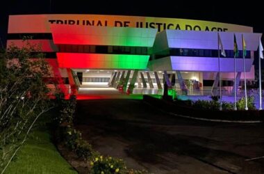 A sede administrativa do Tribunal de Justiça do Acre (TJAC) está iluminada com as cores do arco-íris em alusão ao Mês do Orgulho LGBTQIAP+, celebrado