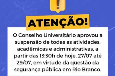 O Conselho Universitário da Universidade Federal do Acre (CONSU), publicou uma nota na tarde desta quinta-feira, 27, anunciando a suspensão das aulas na instituição, após