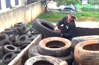 A Secretaria de Meio Ambiente foi acionada nesta segunda-feira (16), para remover grande quantidade de pneus abandonados ao lado do muro da unidade de saúde