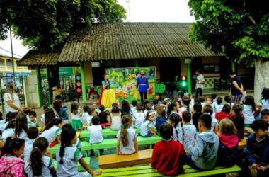 Mais de cem crianças atentas em uma peça de teatro. Além da diversão, as crianças do primeiro ano da escola, Maria das Graças Rocha Rodrigues,