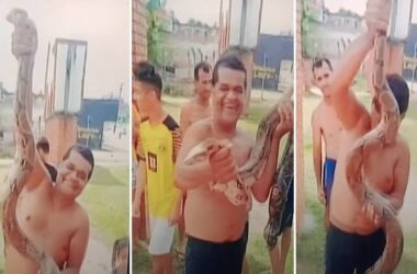 Uma jiboia de aproximadamente três metros de comprimento foi encontrada por um borracheiro que chegou cedo para trabalhar na ‘Borracharia do Louro’, localizada na Estrada