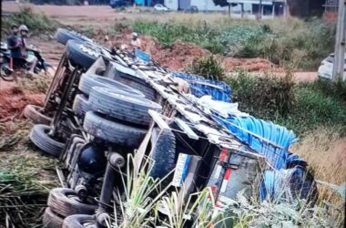Um caminhão Mercedes Benz que saiu de Porto Velho (RO) com destino a Rio Branco (AC), carregado de caixas d’água, capotou na madrugada desta quarta-feira,