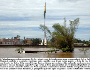 Gleydison Meireles, da redação do AC24Horas ggreyck@gmail.com Faltando poucos centímetros para o Rio Acre atingir a cota de transbordamento, a coordenação da Defesa Civil Municipal,