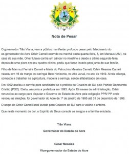 Pode ter sido uma falha grave do cerimonial do governo do Acre, que em nota de Pesar comunica a morte do ex-governador do Estado, Orleir