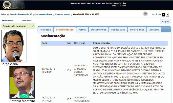 Ray Melo, com informação do MPF e TRF1 raymelo@ac24horas.com A juíza da 2ª Vara Federal da 1a. Região acatou a ação de improbidade administrativa proposta