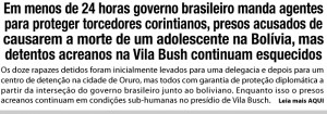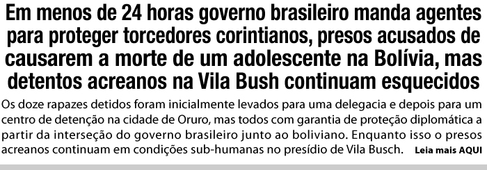 Luciano Tavares – da redação de ac24horas lucianotavares@ac24horas.com O tratamento dispensado pelo governo brasileiro a 12 torcedores do Corinthians, presos na Bolívia, acusados pela polícia