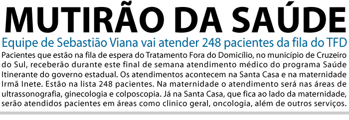 Luciano Tavares – da redação de ac24horas lucianotavares@ac24horas.com Pacientes que estão na fila de espera do TFD no município de Cruzeiro do Sul receberão durante