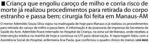Da redação de ac24horas O menor Ademildo Souza Silva viajou na madrugada de hoje para Manaus e já realizou os procedimentos para retirada do caroço