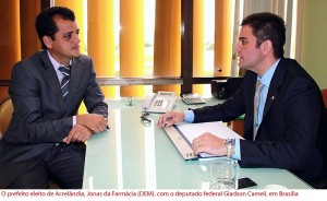O prefeito eleito de Acrelândia, Jonas da Farmácia (DEM), visitou o deputado federal Gladson Cameli (PP) em seu gabinete em Brasília. Na visita, Jonas pediu