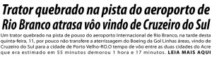 Um trator quebrado na pista de pouso do aeroporto Internacional de Rio Branco, na tarde desta quinta-feira, 11, por pouco não transfere a aterrissagem do