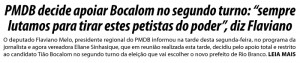 Minutos depois de o deputado Flaviano Melo ter anunciado o apoio do PMDB ao candidato Tião Bocalom (PSDB) no segundo turno da eleição que vai