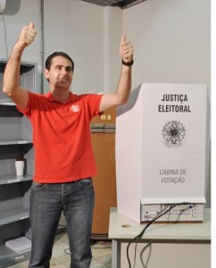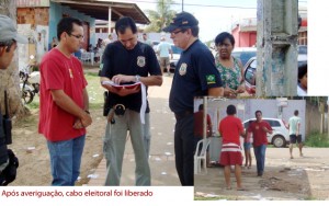 Faixa vermelha é colocada na entrada de seção eleitoral na escola estadual João Aguiar