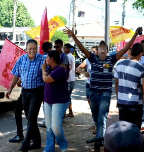Fernando Melo até que tentou, mas não conseguiu passar despercebido por um grupo de militantes do PT que promoviam um bandeiraço na Rua Marechal Deodoro,