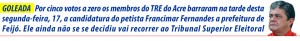 Da redação de ac24horas O Tribunal Regional Eleitoral do Acre (TRE-AC) deu provimento ao recurso que pedia a impugnação da candidatura do petista Francimar Fernandes