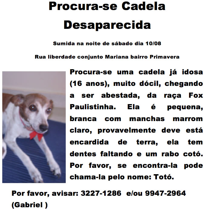 O estudante Gabriel Alódio, busca por meio de cartaz e das redes sociais, ajuda para encontrar sua cadelinha que atende por Totó, desaparecida desde o